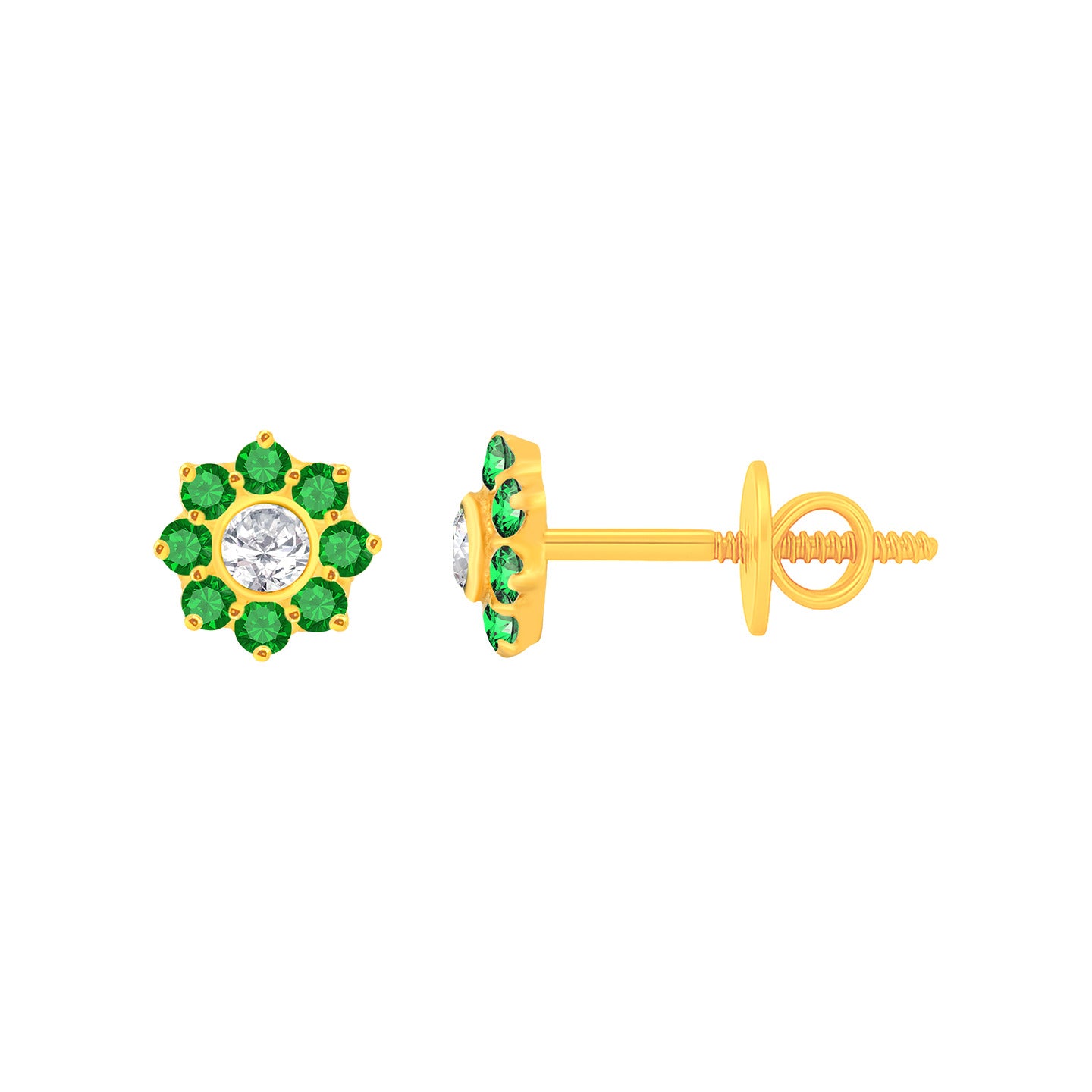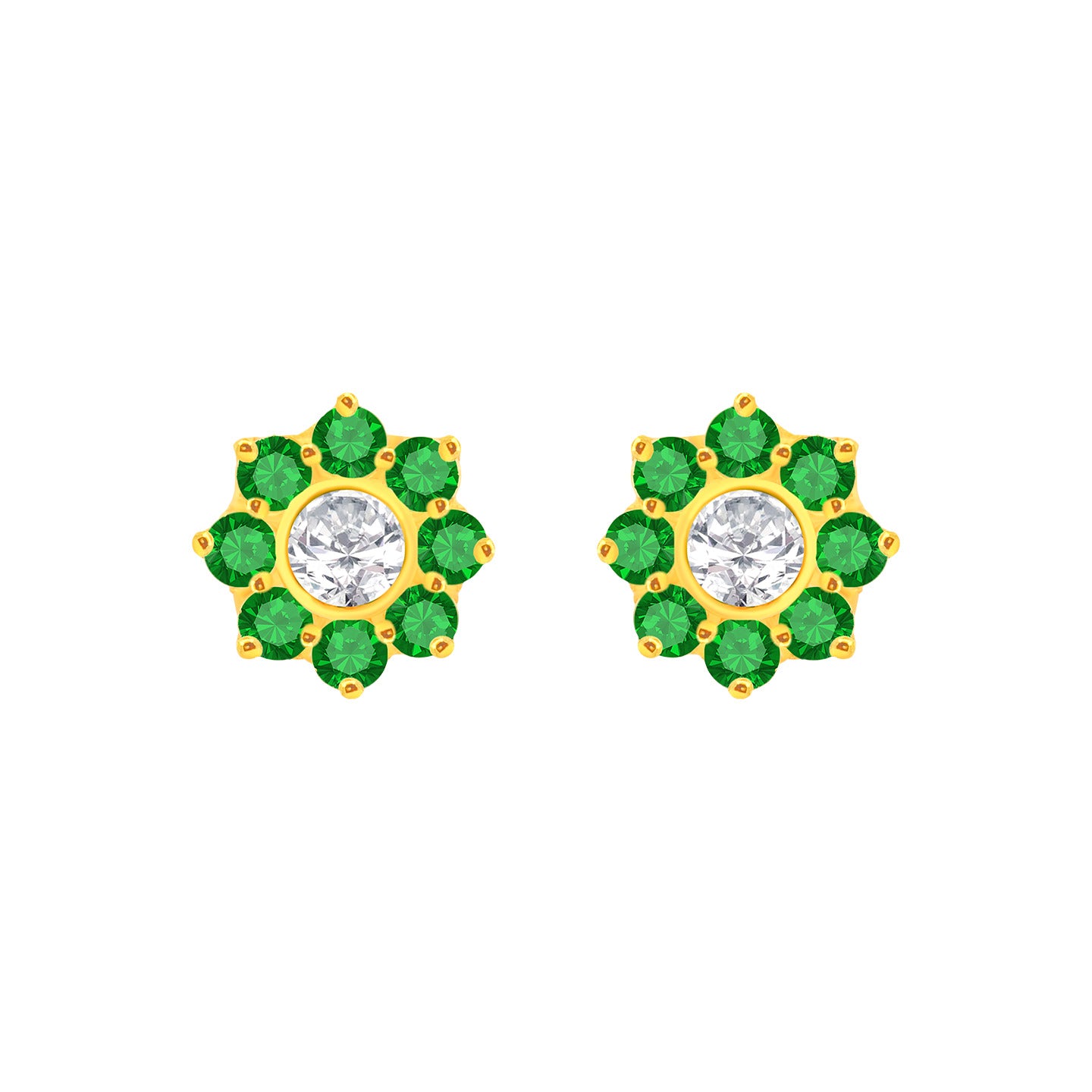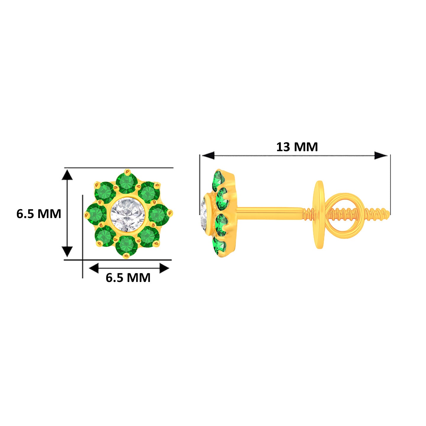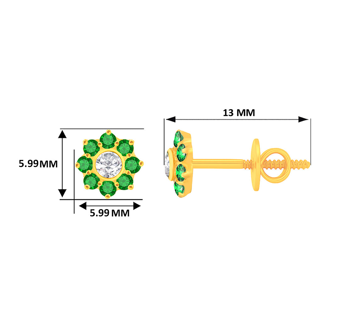 22k Yellow Gold Cubic Zirconia Green Stud Earrings measuring 5.99mm length x 5.99mm width. Total gold weight is approximately 1.087g.