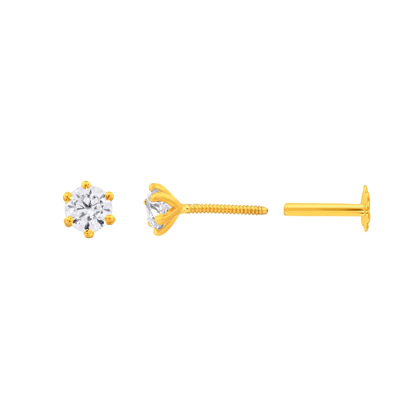 22K Yellow Gold Cubic Zirconia Small Sparkling Nose Pin with Wire measuring 3.1mm width. Total gold weight is approximately 0.2g. For health and safety reasons, nose pins and nose rings CANNOT BE exchanged or returned once purchased.