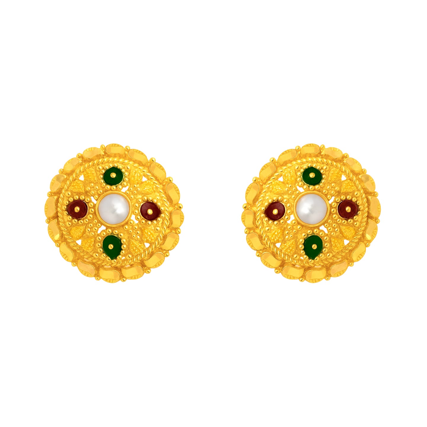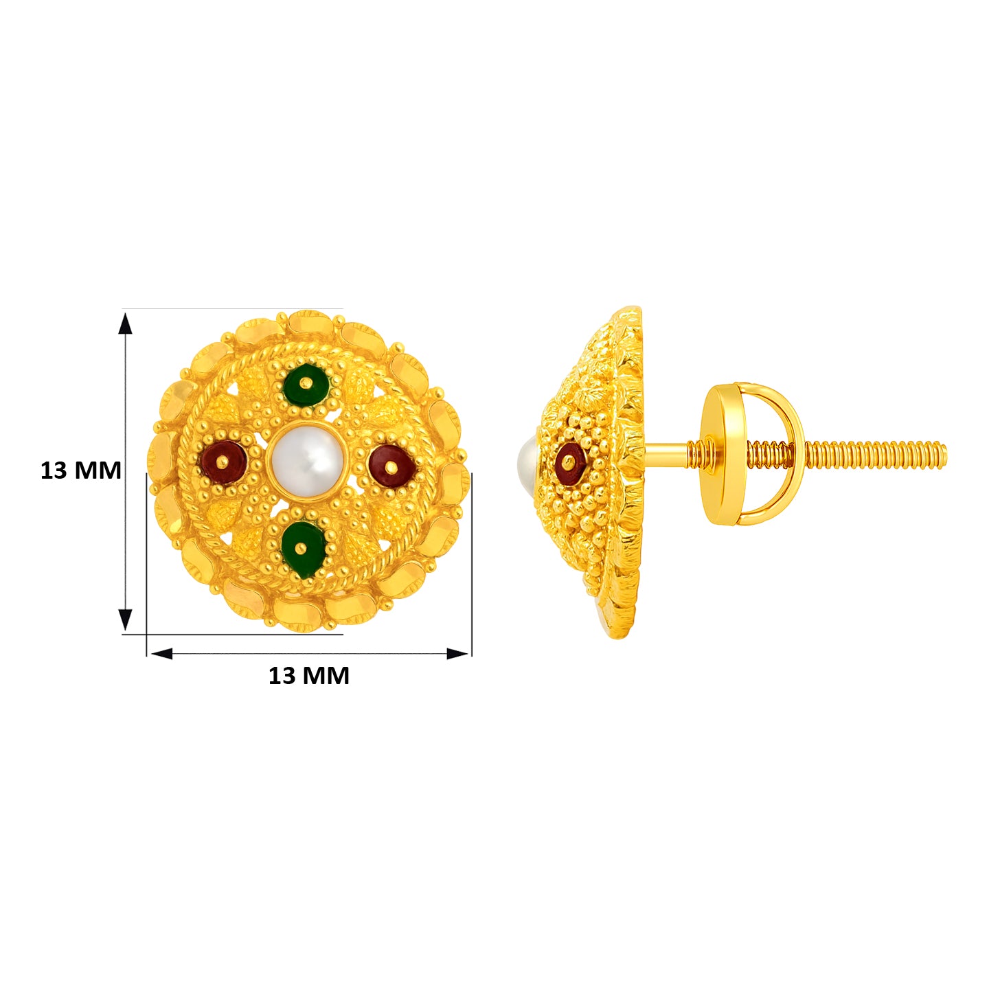 22k Yellow Gold MeenakariOrnamental Earrings measuring 13mm length x 13mm width. Total gold weight is approximately 4.22g.