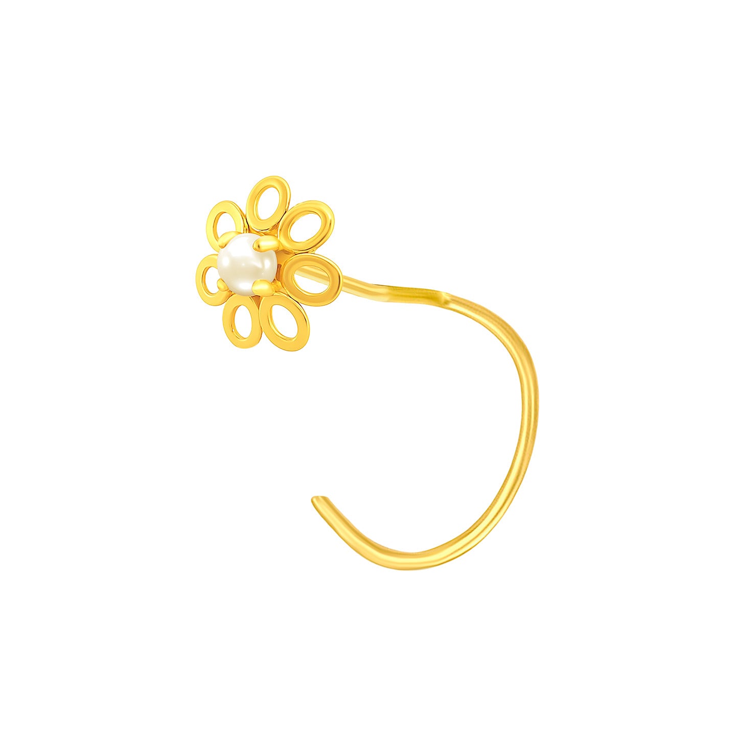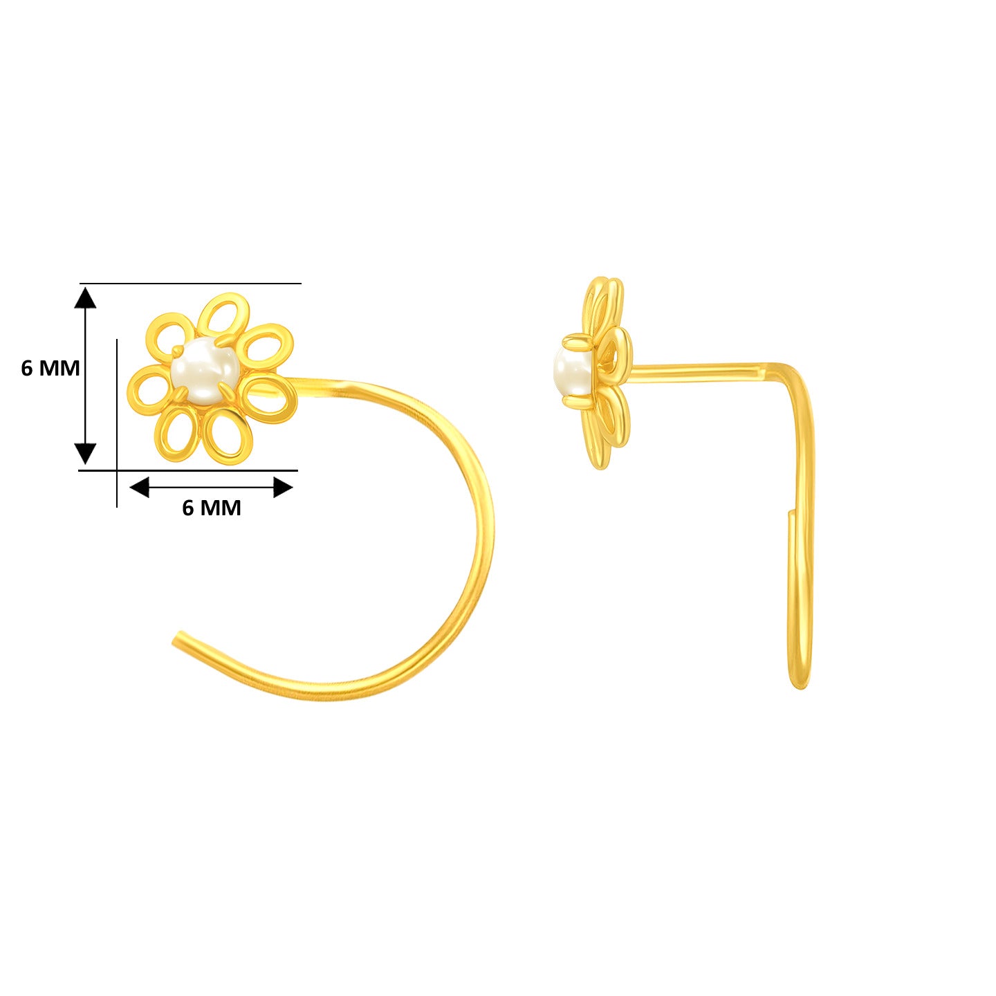 22K Yellow Gold Pearl Large Floral Nose Pin with Wire measuring 6mm width. Total gold weight is approximately 0.24g. For health and safety reasons, nose pins and nose rings CANNOT BE exchanged or returned once purchased.