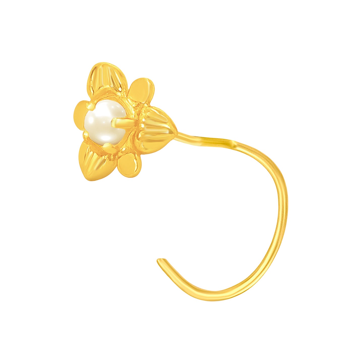 22K Yellow Gold Pearl Large Floral Nose Pin with Wire measuring 6mm width. Total gold weight is approximately 0.25g. For health and safety reasons, nose pins and nose rings CANNOT BE exchanged or returned once purchased.