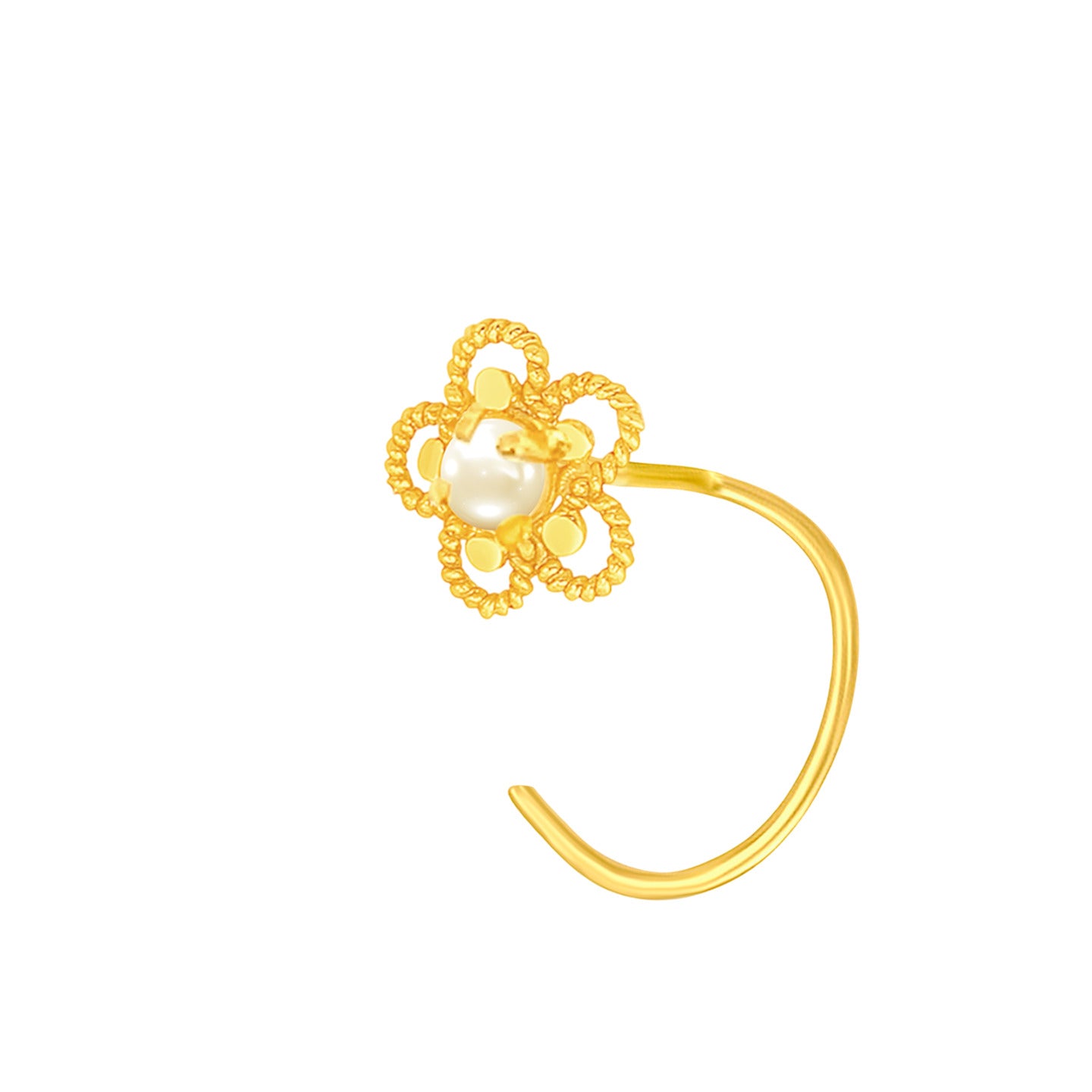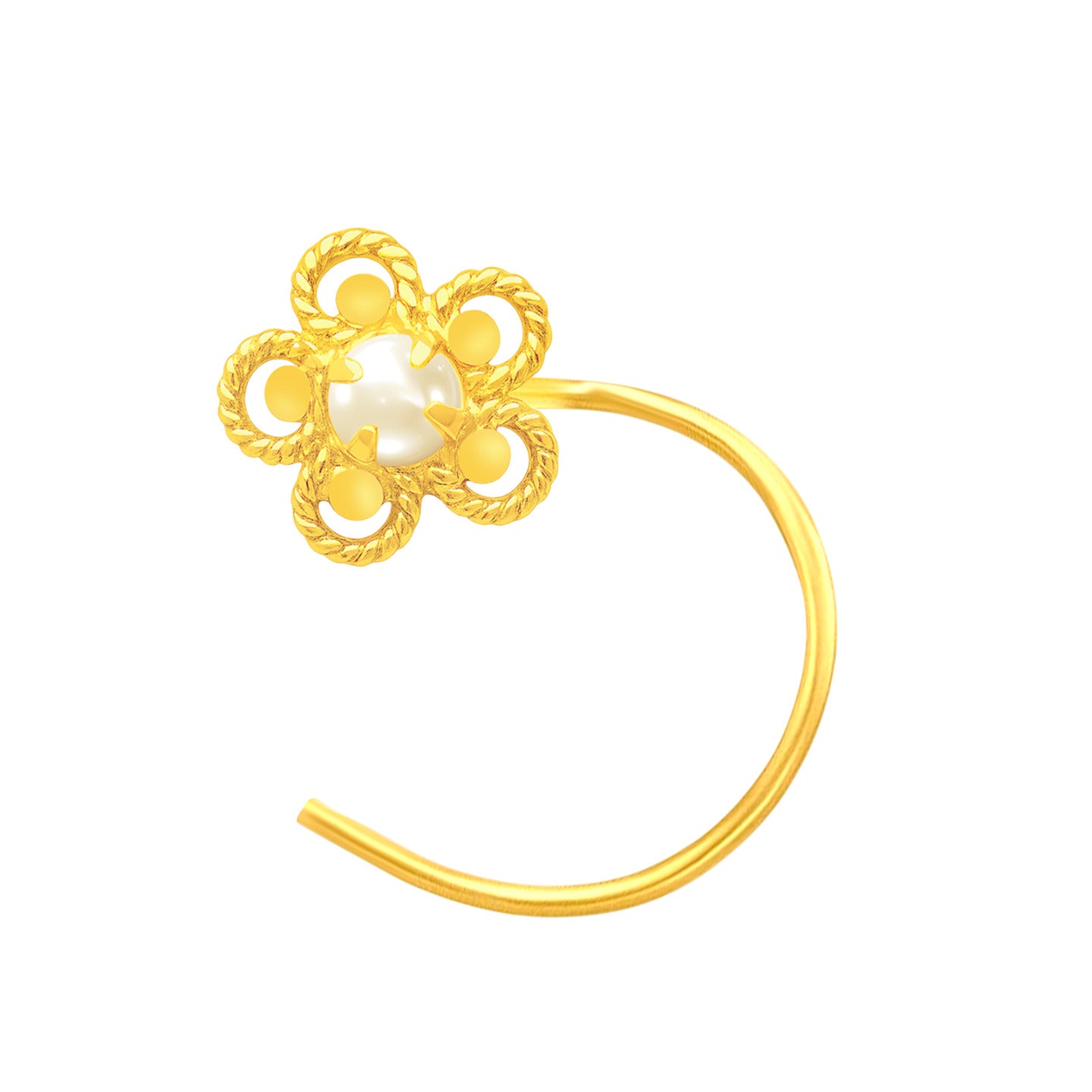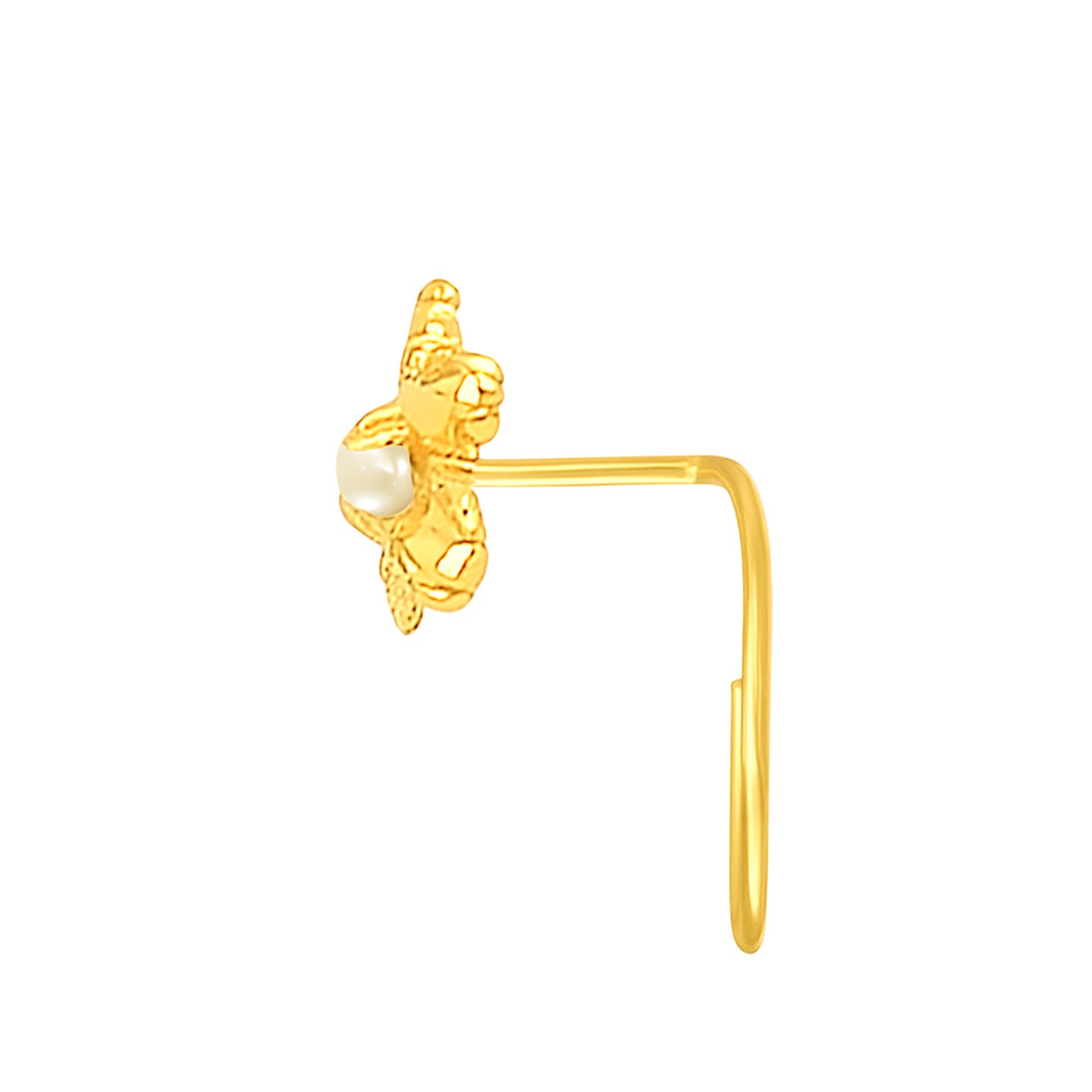 22K Yellow Gold Pearl Large Floral Nose Pin with Wire measuring 6mm width. Total gold weight is approximately 0.3g. For health and safety reasons, nose pins and nose rings CANNOT BE exchanged or returned once purchased.