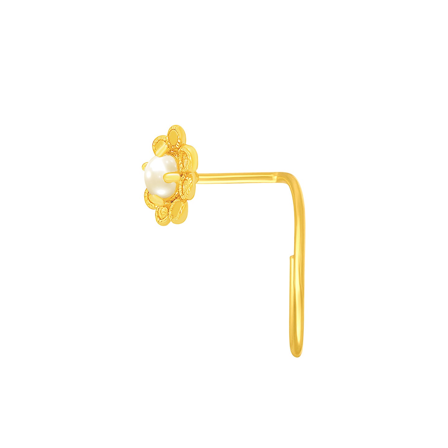 22K Yellow Gold Pearl Medium Floral Nose Pin with Wire measuring 6mm width. Total gold weight is approximately 0.25g. For health and safety reasons, nose pins and nose rings CANNOT BE exchanged or returned once purchased.