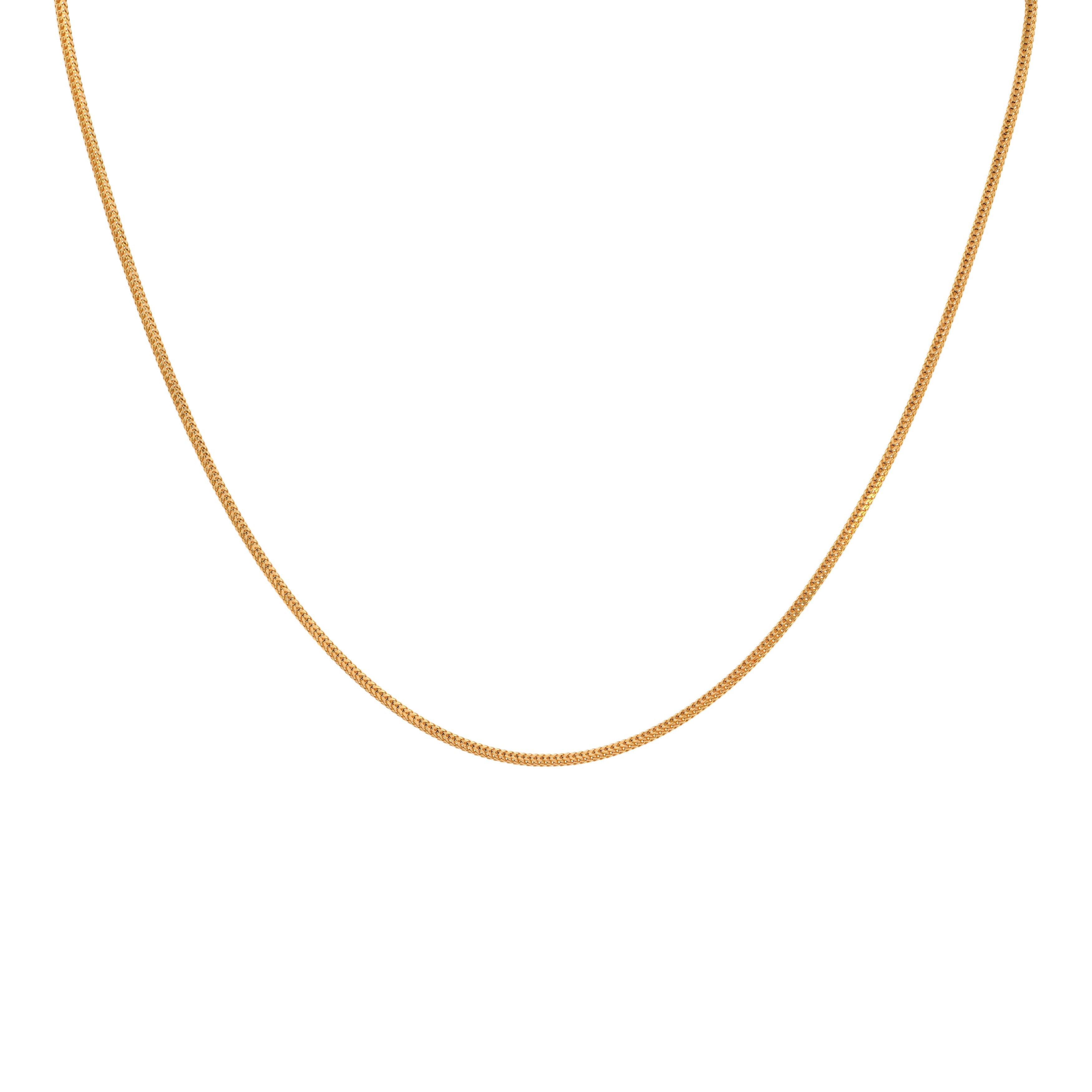 22k Yellow Gold Round Fox Chain measuring 1.5mm width x 18 inch length. Total gold weight is approximately 5.669g.