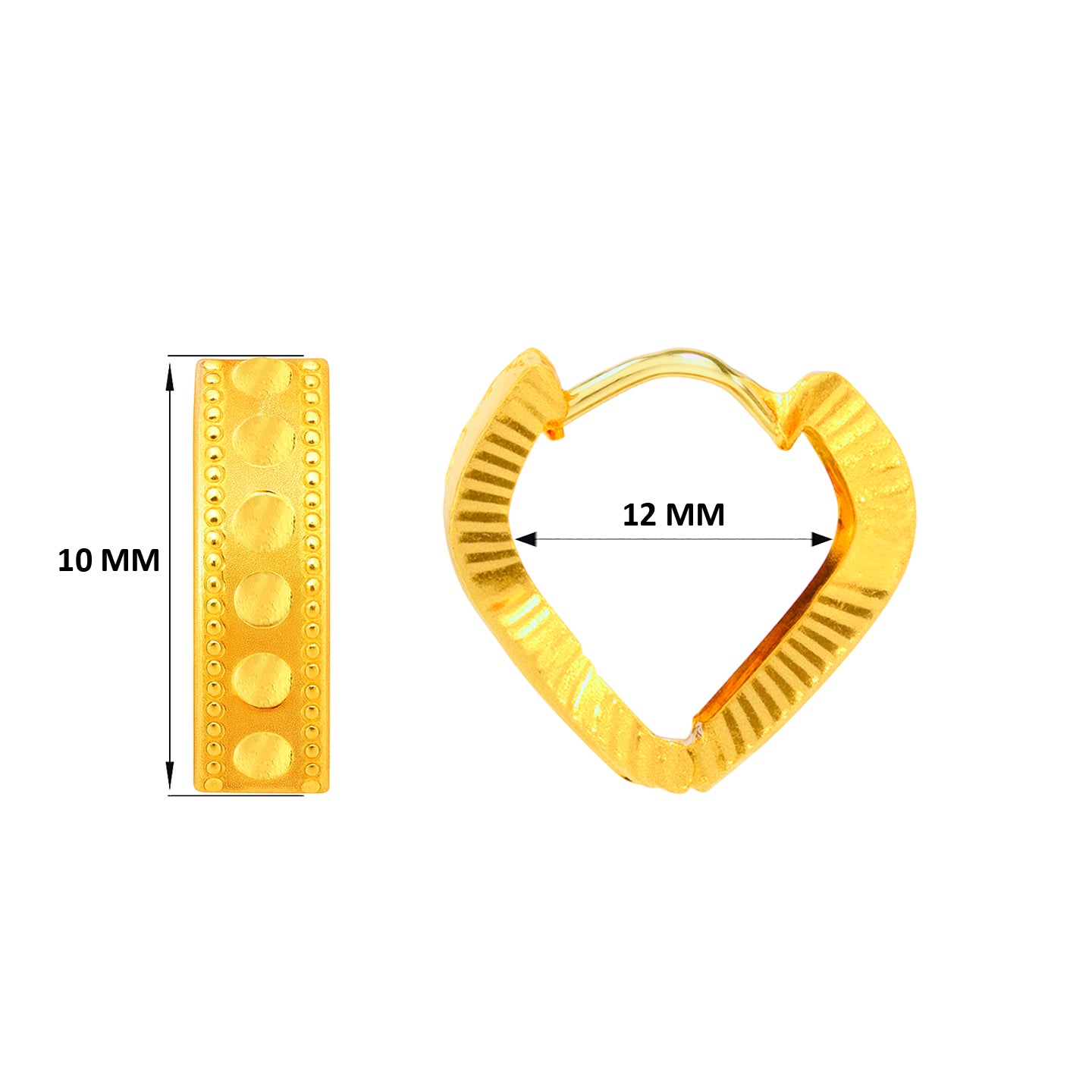 22k Yellow Gold Small Radiant Heart Earrings measuring 10mm width x 12mm length. Total gold weight is approximately 3.33g.