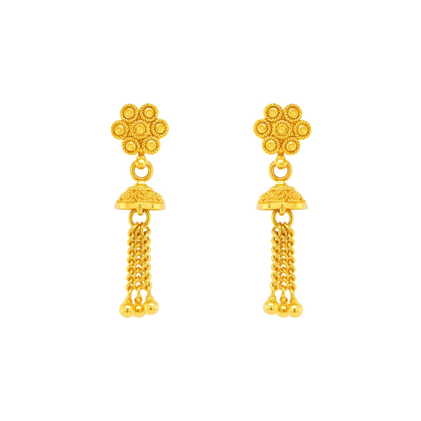 22k gold jhumka earrings. Earring design features floral screwback tops and ornate jhumka. Screwback top measures 6mm in diameter. Jhumkas measure 6mm in diameter. Earrings measure 24mm from top to bottom.