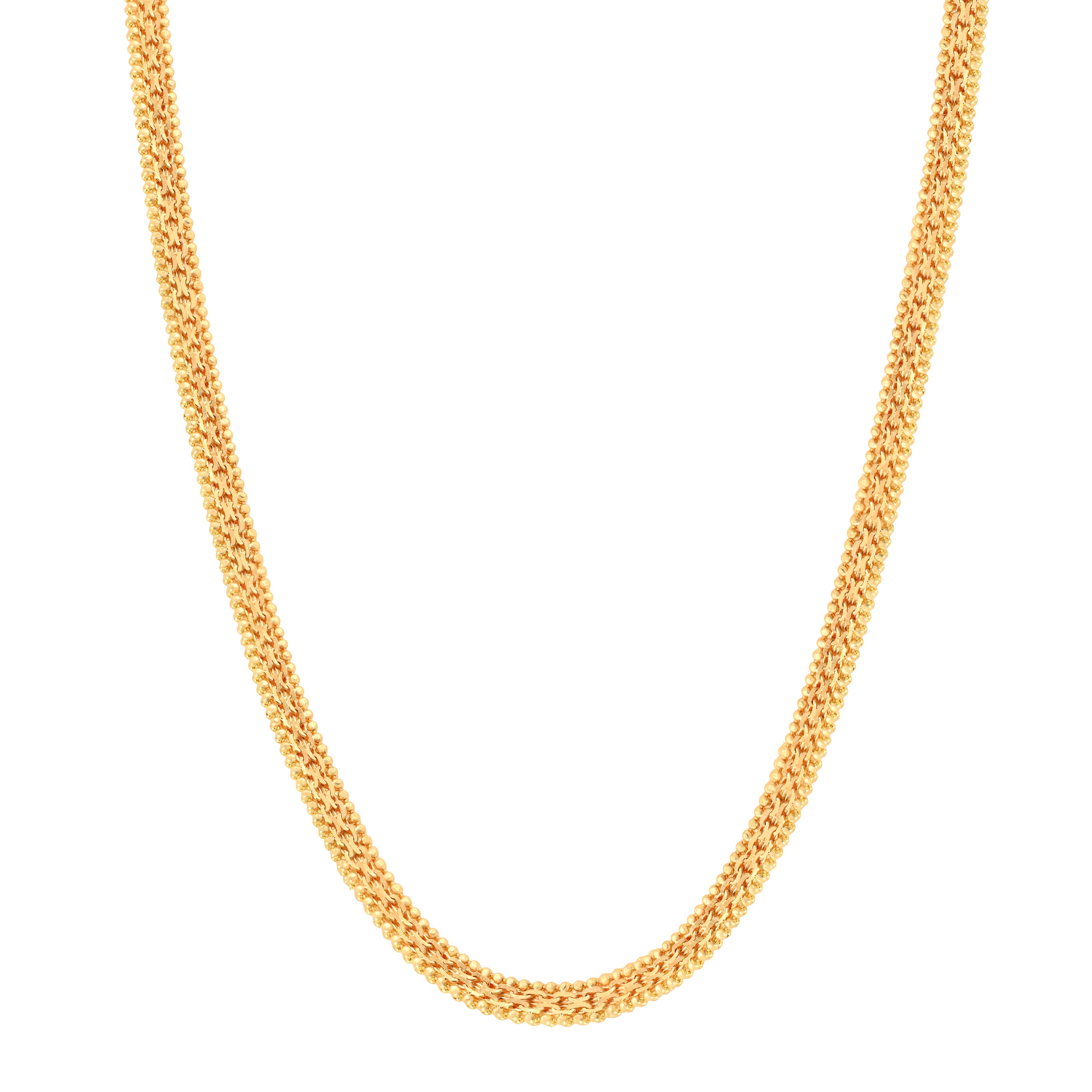 22 karat gold cube boxed chain variation with lobster clasp. The length is 31.5 inches, width is 3 mm.