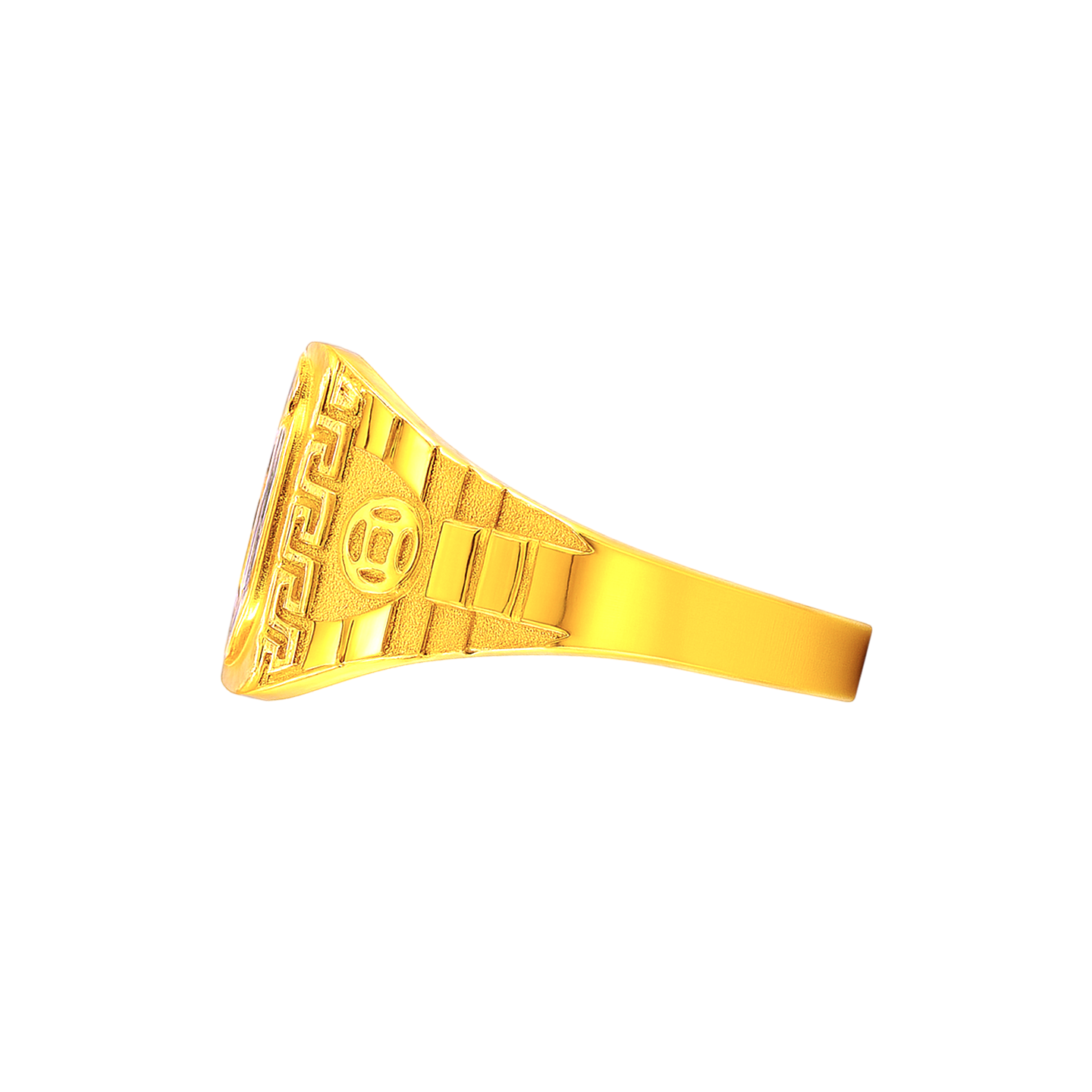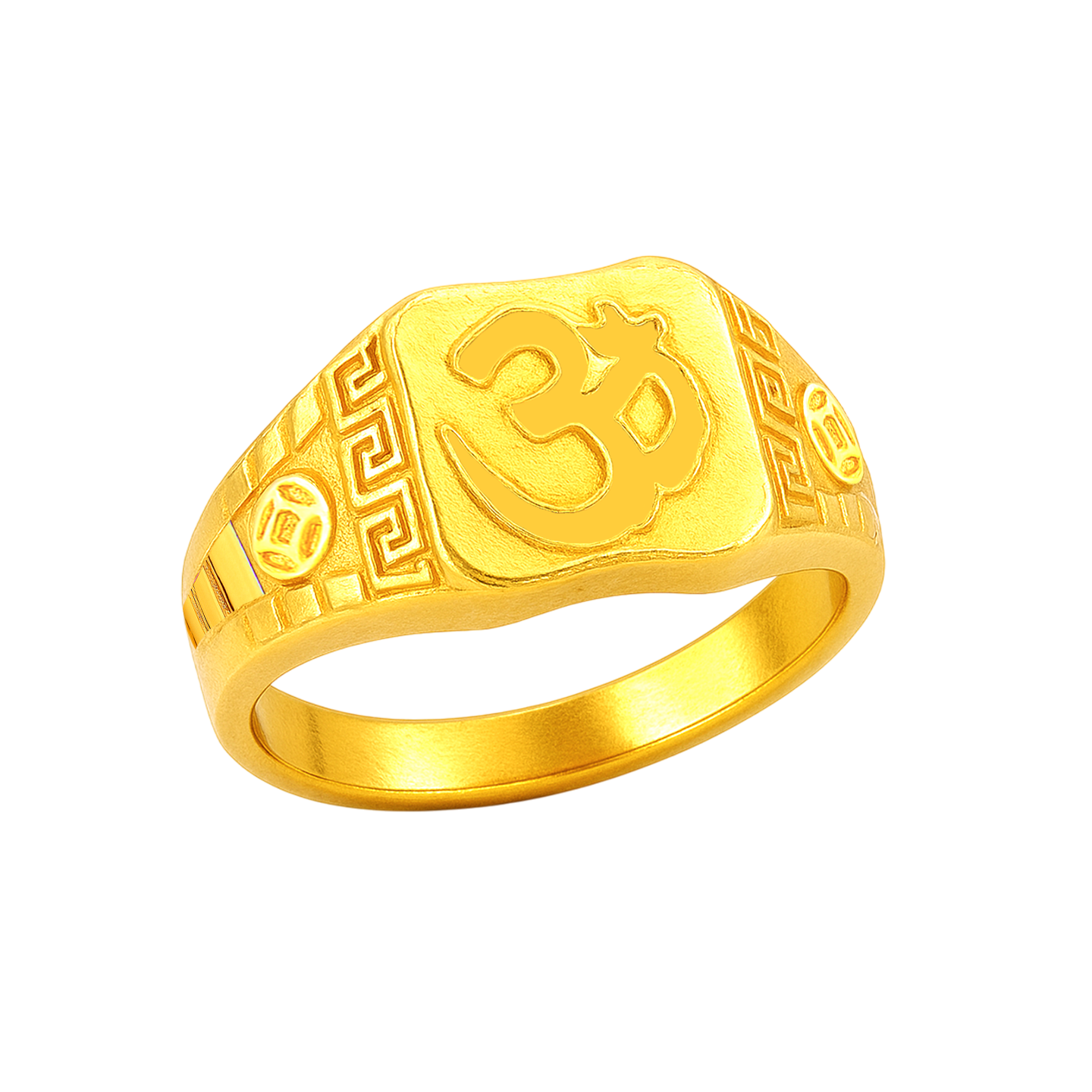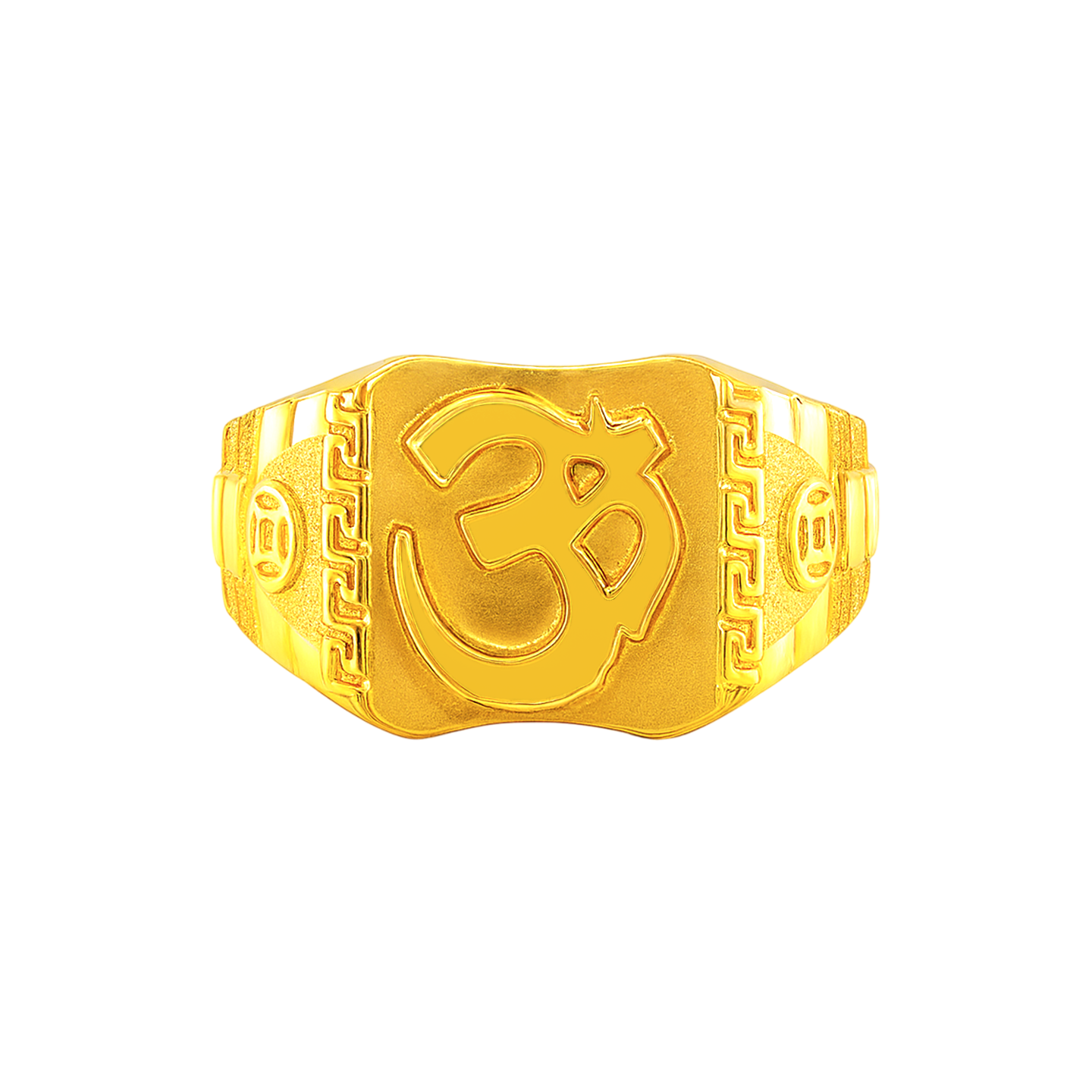 22k gold ring for men. Richly carved Om ring for men. Ring measures 4mm to 14mm in thickness. Ring size is 9.5.