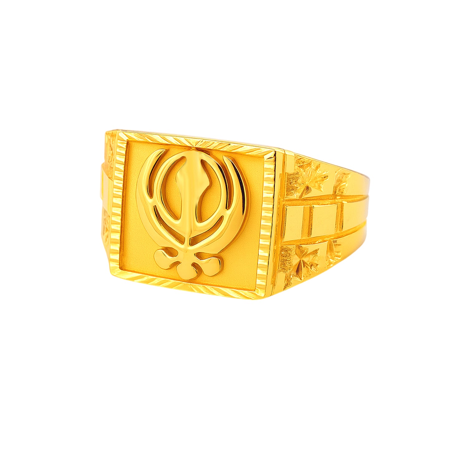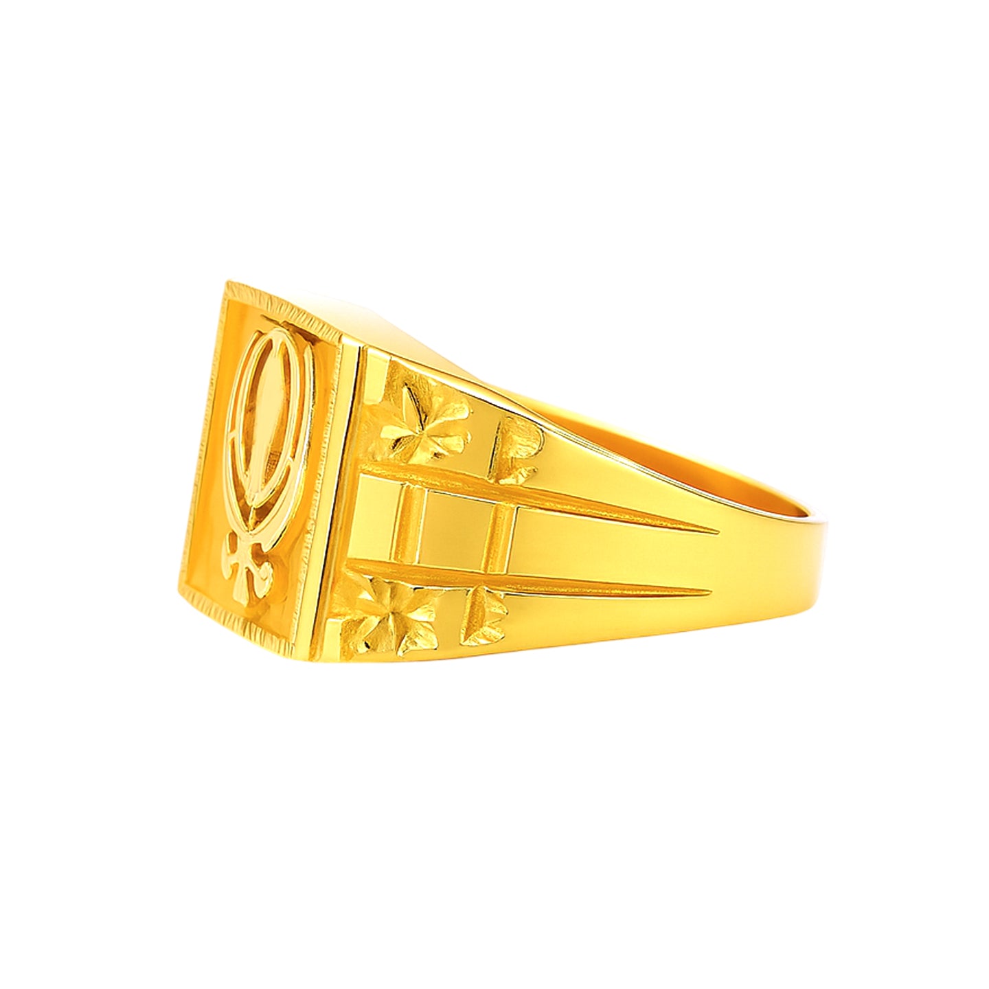 22k gold ring with front design measuring 12mm in height and 14mm wide. Band measures 3mm thick. Ring size is 10.